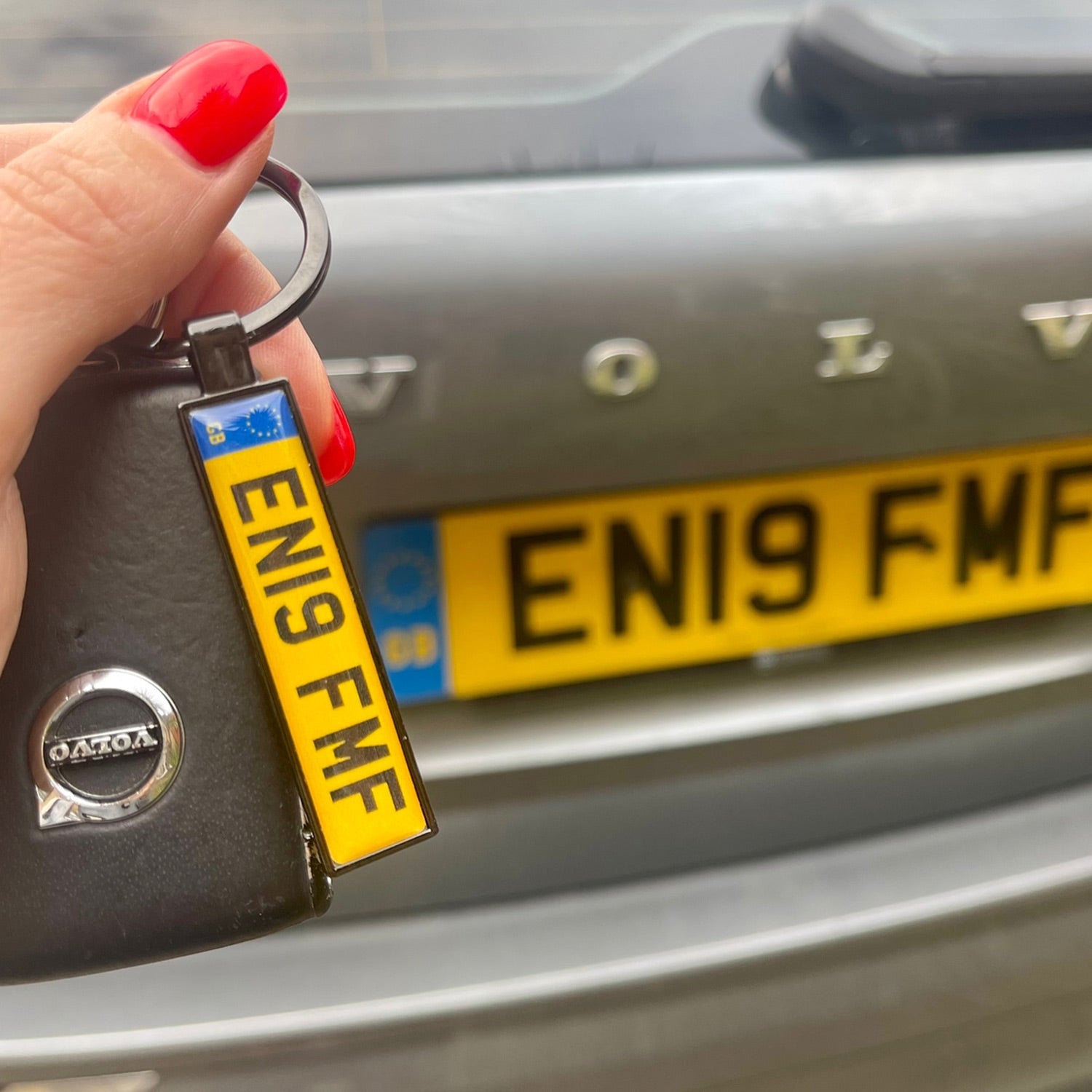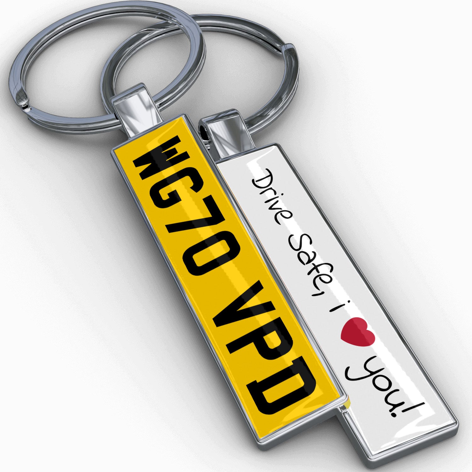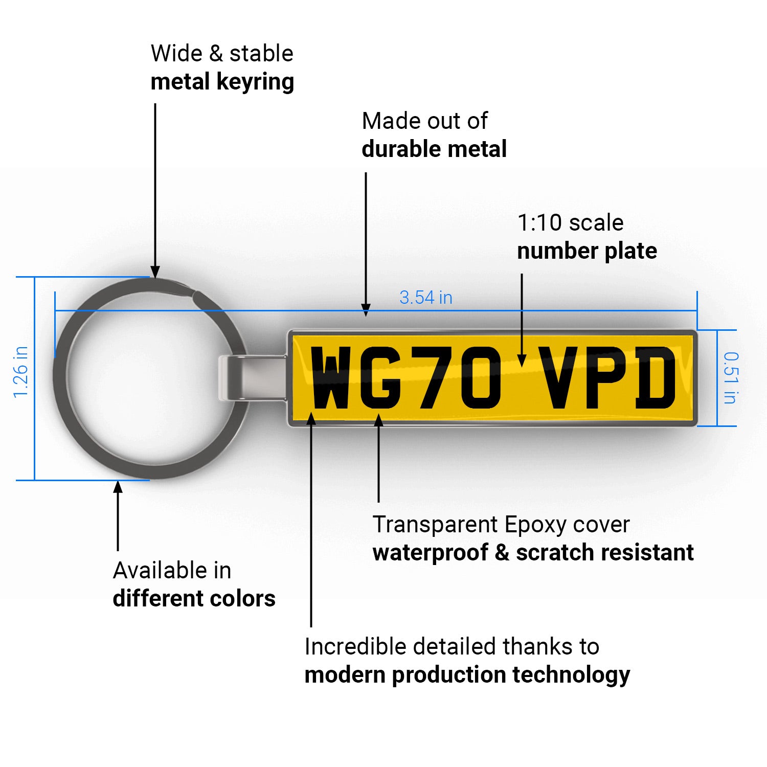 Introducing PimpMyKey's custom metal keychain featuring a personalised number plate design. This keychain is proudly made in the UK and is made from durable metal and features a sleek, modern design that is perfect for anyone looking to add a touch of personalisation to their keys. The keychain is lightweight and easy to carry, making it the perfect accessory for your keys, bags, or even as a rearview mirror accessory. The keychain has a 1:10 scale of the original number plate. On the back side of the keychain, you can have a custom image, logo, or text such as a greeting, poem or any custom message. You can personalize it with your own number plate, making it a great gift idea for friends and family.