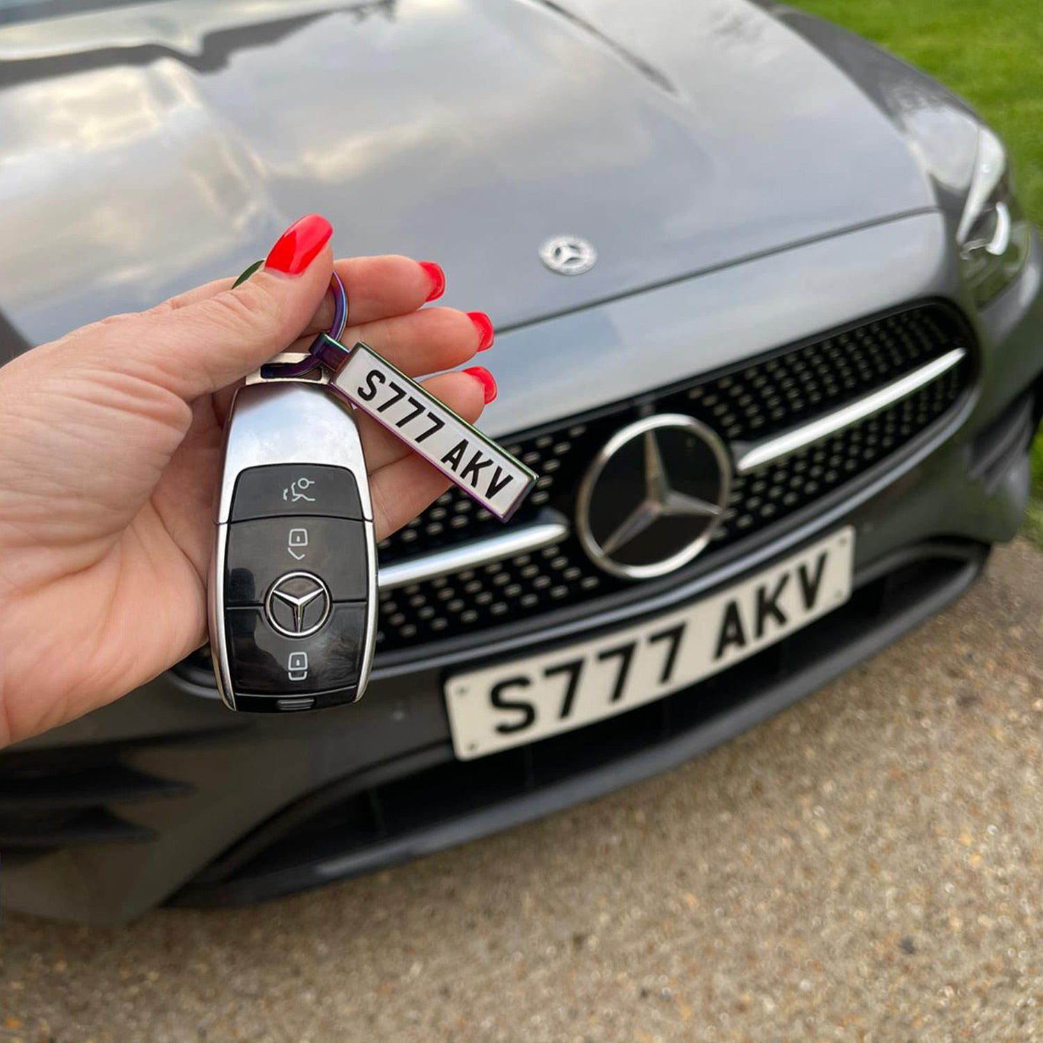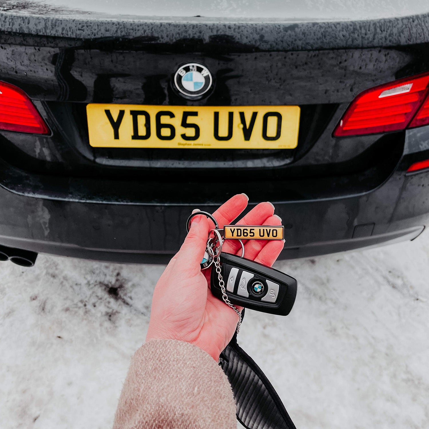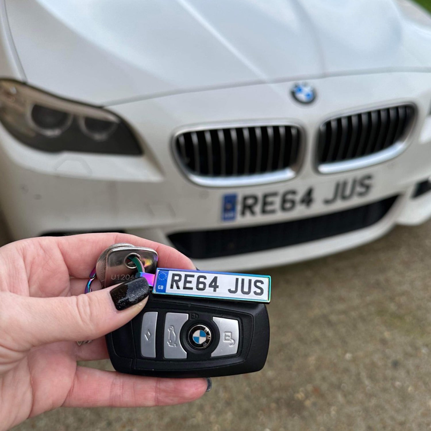 Introducing PimpMyKey's custom metal keychain featuring a personalised number plate design. This keychain is proudly made in the UK and is made from durable metal and features a sleek, modern design that is perfect for anyone looking to add a touch of personalisation to their keys. The keychain is lightweight and easy to carry, making it the perfect accessory for your keys, bags, or even as a rearview mirror accessory. The keychain has a 1:10 scale of the original number plate. On the back side of the keychain, you can have a custom image, logo, or text such as a greeting, poem or any custom message. You can personalize it with your own number plate, making it a great gift idea for friends and family.
